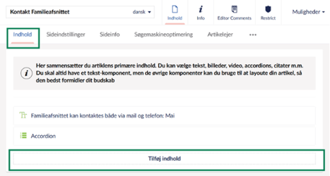 Find accordionfunktionen ved at klikke på ’Tilføj indhold’ i backoffice og vælg derefter ’accordion’.