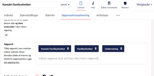 Tænk over, hvilke ord eller vendinger medarbejdere typisk vil søge på. Skriv søgeord ind i backoffice ved at klikke på ’Søgemaskineoptimering’ og vælg derefter ’søgeord’. Skriv herefter det relevante søgeord og tryk enter.
